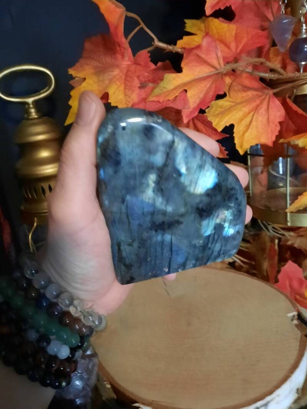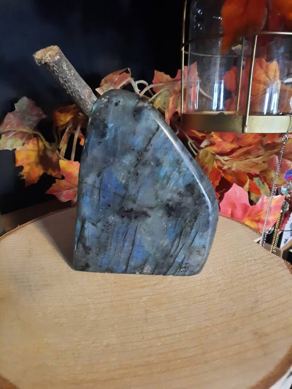 Labradoriet is een sterk beschermende en spirituele steen. Het beschermt het eigen energieveld (aura) tegen negatieve invloeden uit de omgeving en mensen die energie bij je wegnemen. De steen vermindert angst en geeft kracht, (zelf)vertrouwen en doorzettingsvermogen. Het versterkt de intuïtie en mediamieke gaven.